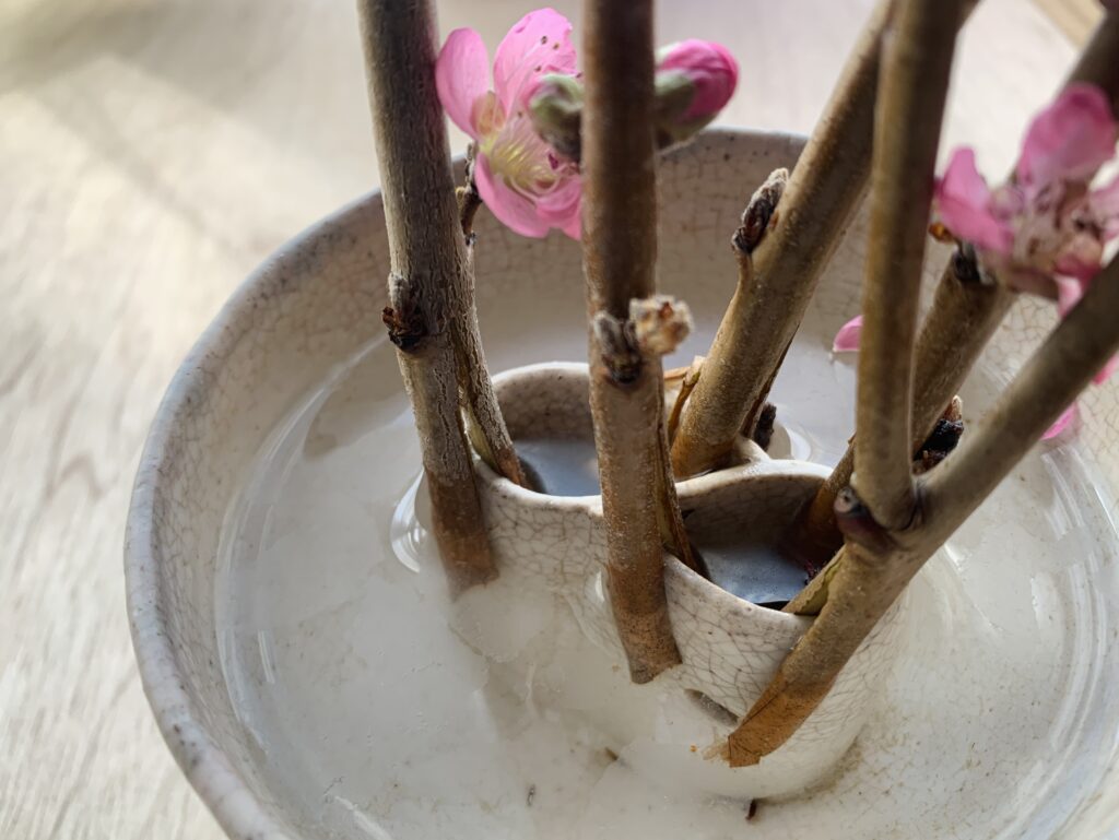 これはハナモモの枝を縦に2〜3cmほど割って、花留めを挟む様に挿したもの。