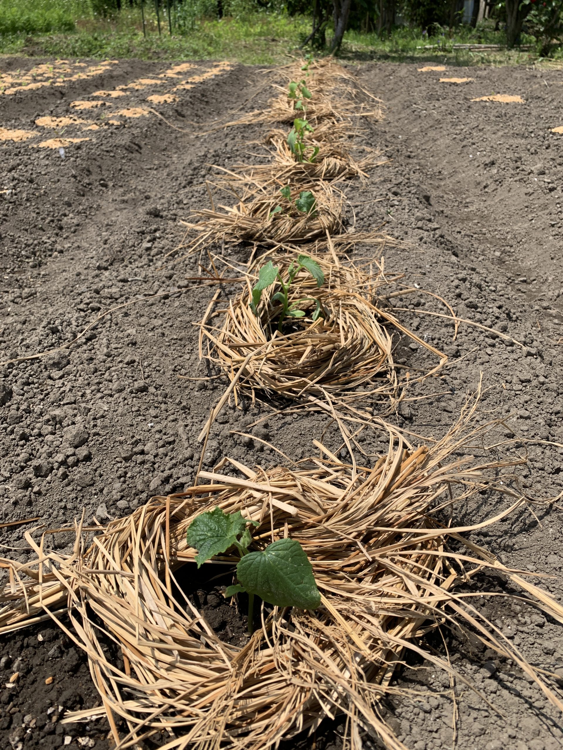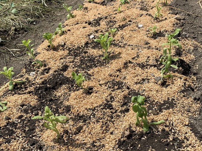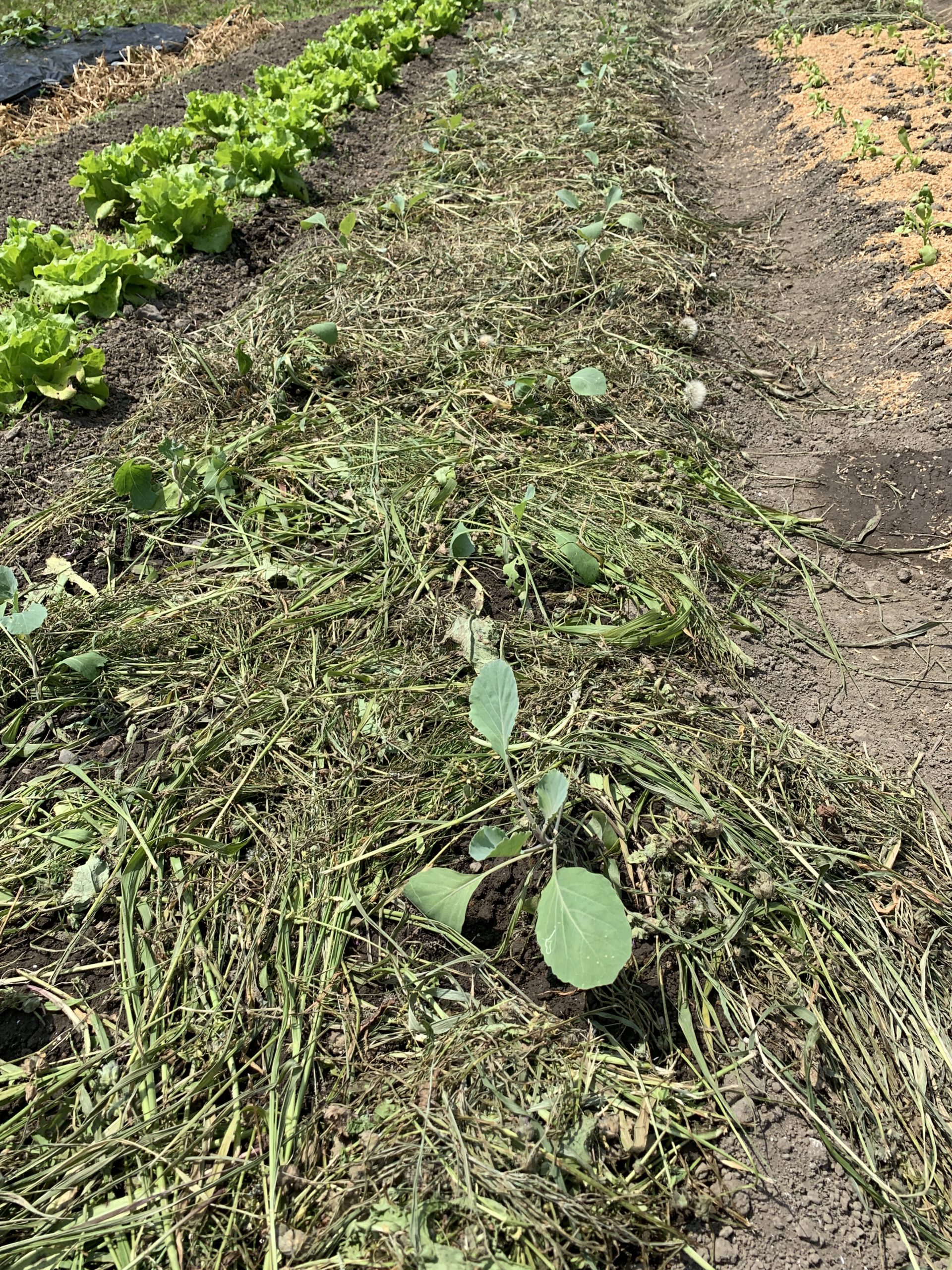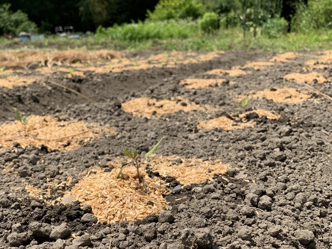 刈った草を草マルチに使い、足りない分はワラと籾殻で地表を覆う。