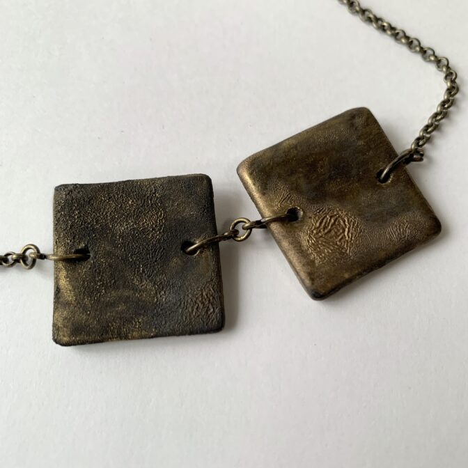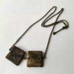 ペンダント twin pendant (antique gold / metallic black) 通常価格 7700 円 (税込) 購入はこちら ※商品価格以外に別途送料(1回の注文につき1,000円)がかかります。 説明 size: chain− 約52㎝ + 5㎝ pendant− 約2.5㎝ × 2.5㎝ ×2 / 15g 2個の四角のパーツのペンダントトップで少し色を変えてあります。 トップの位置をずらせてブローチのようにお使いいただいてもステキです。 陶器製ですのでご使用の際はご注意ください。 コメントは受け付けていません。