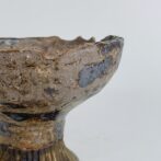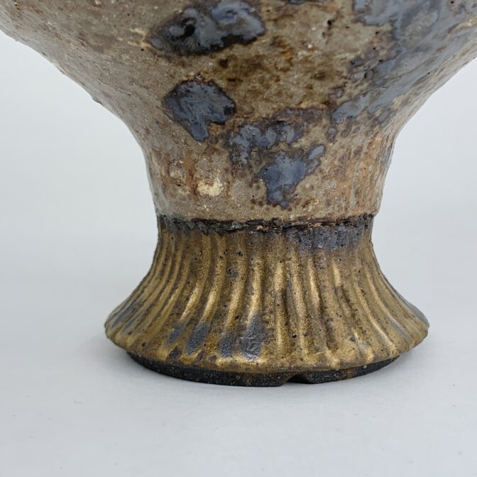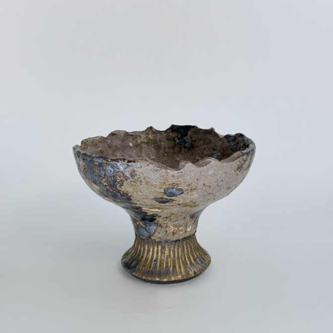原土の荒々しい質感に大胆な釉薬を施した本体と、アンティークゴールドの金属的な高台を合わせた、コンポート型の植木鉢です。