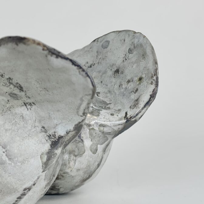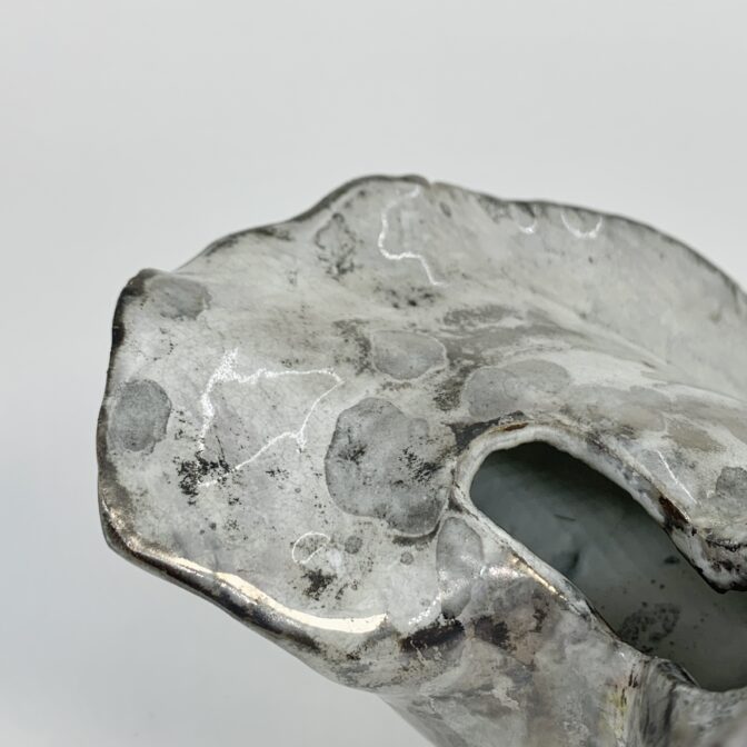 乳白釉の上に銀彩を焼き付けており、濃淡によってシミの様な不思議な模様が現れています。