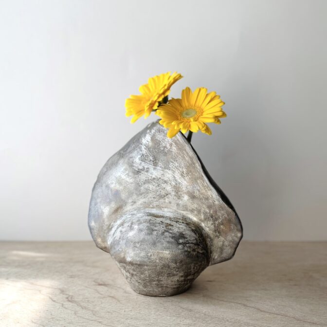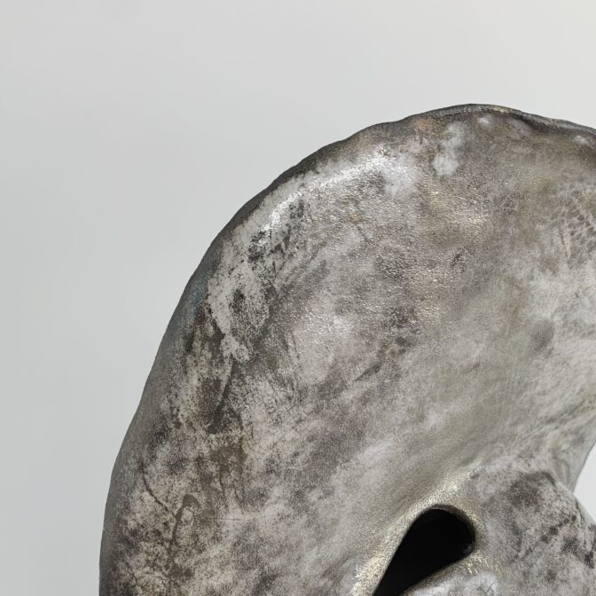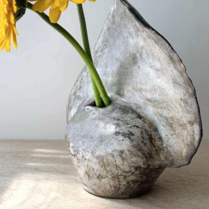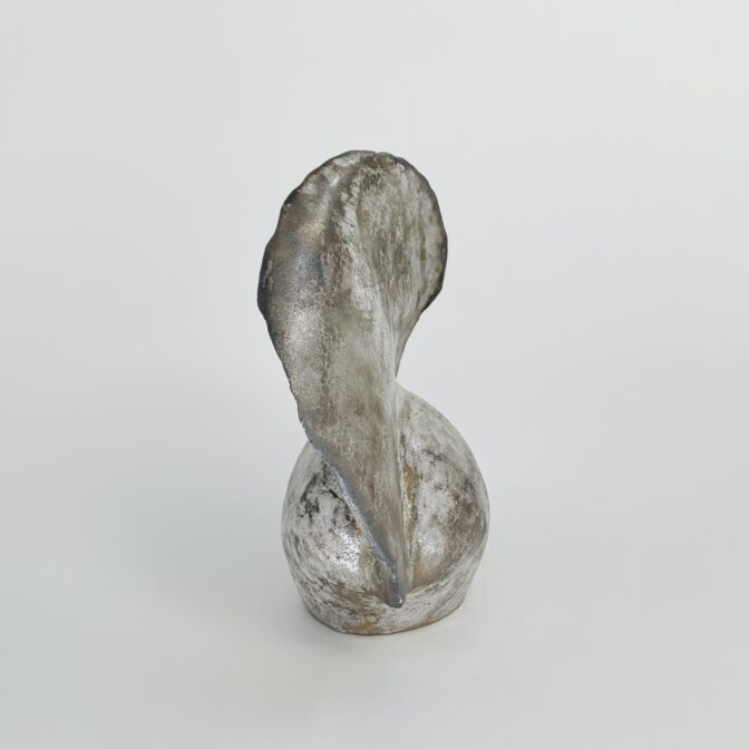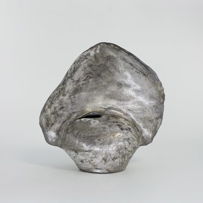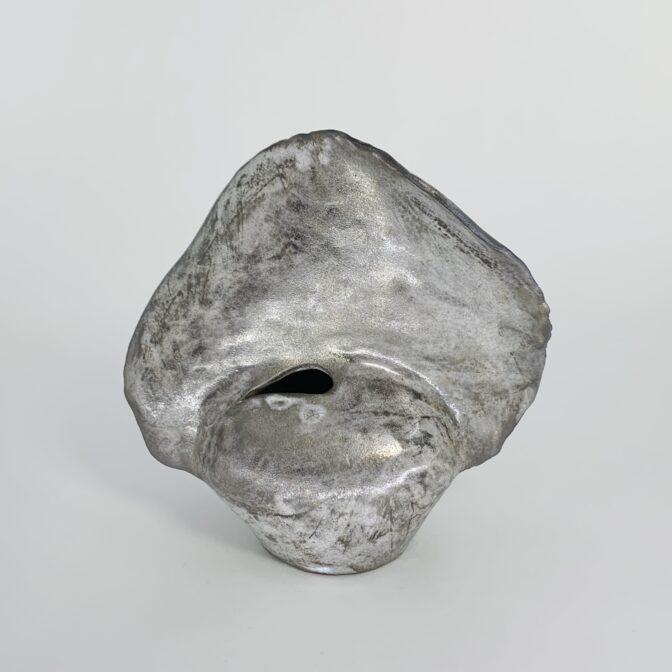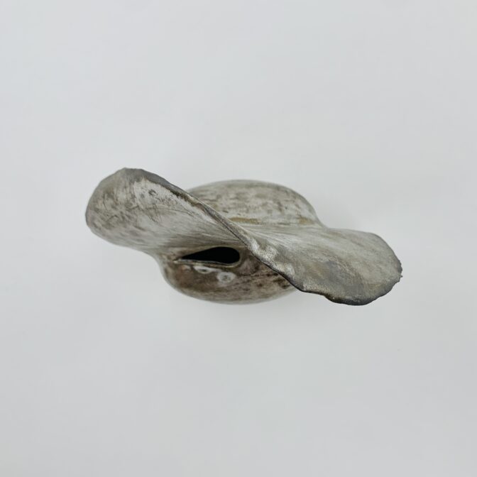 花器 | vase一輪挿し entada glandulosa vase (white × silver) 通常価格 19800 円 (税込) 購入はこちら ※商品価格以外に別途送料(1回の注文につき1,000円)がかかります。 説明 size: 約φ18㎝ ✕ φ7㎝ ✕ H18.5㎝ チビモダマと呼ばれるマメ科の種子がモチーフの花器です。 乳白釉の上に銀彩を焼き付けており、濃淡が独特な風合いと光沢を生み出しています。 変わった形ですが、花材を挿したときに裏・表・サイドと、角度による表情の変化をお楽しみいただけます。 使う度に変化してゆく質感もお楽しみください。 コメントは受け付けていません。