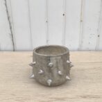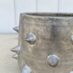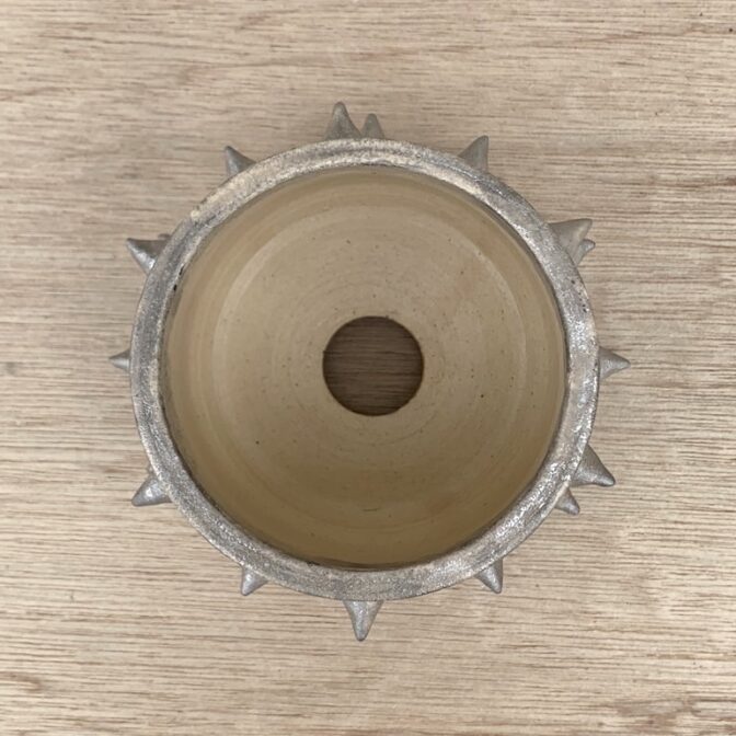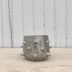 サイドに棘を並べ、腰が丸みを帯びた半筒形の鉢は、どこか可愛らしさのある個性的な植木鉢です。