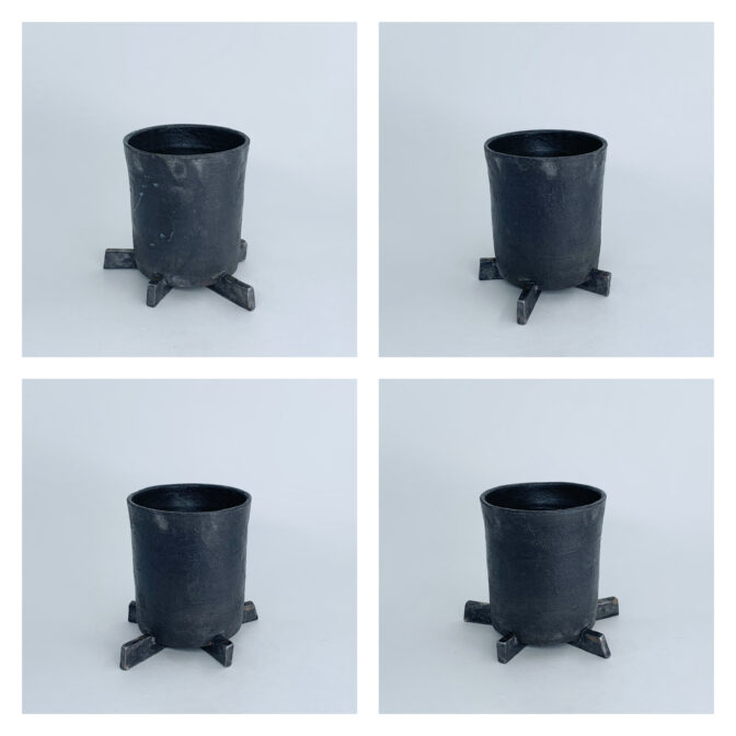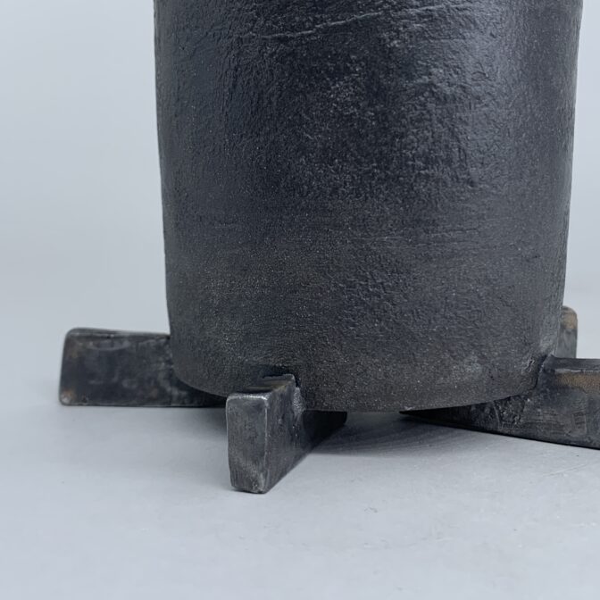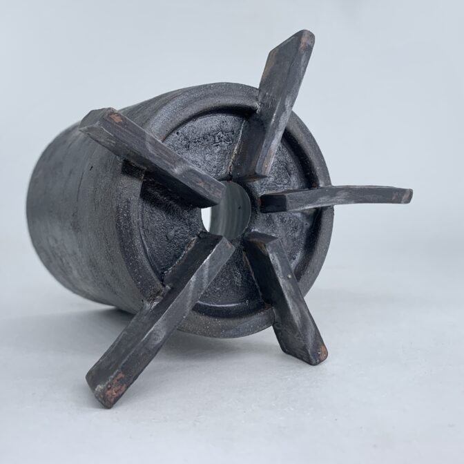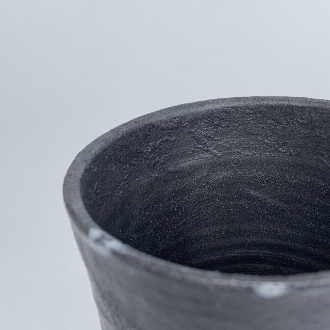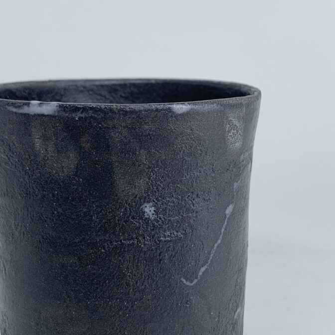 円筒形の本体に黒泥を薄くペイントし、極薄めの灰釉薬を施しています。