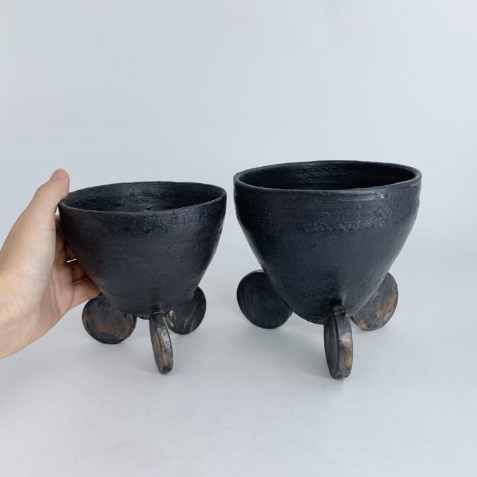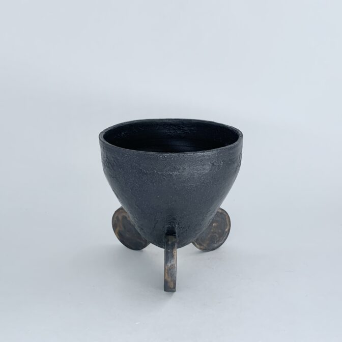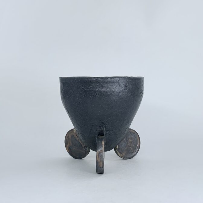 3つのメタルコインの上に鉢が載っているようにも見えます。