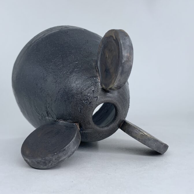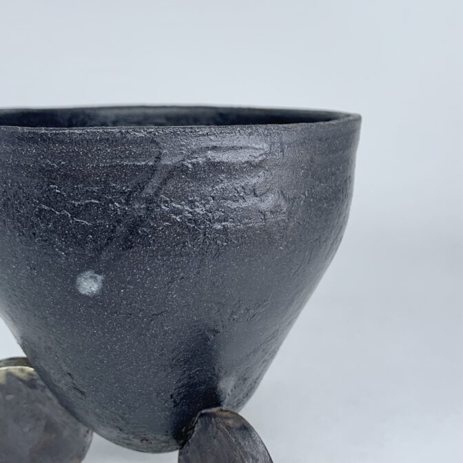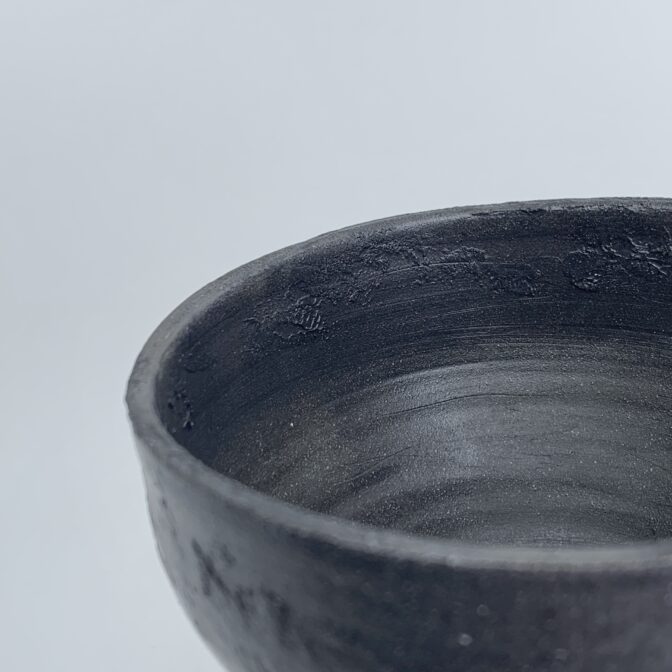 碗形の本体に黒泥を薄くペイントし、極薄めの灰釉薬を施しています。