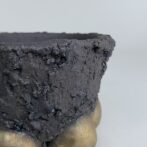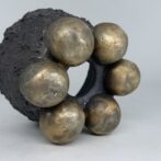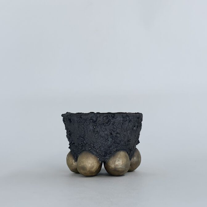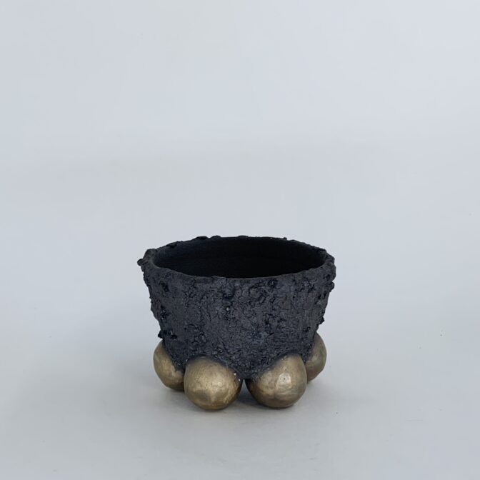 原土を塗った荒々しい質感の鉢と、金属のようなゴールドの球体を組み合わせました。