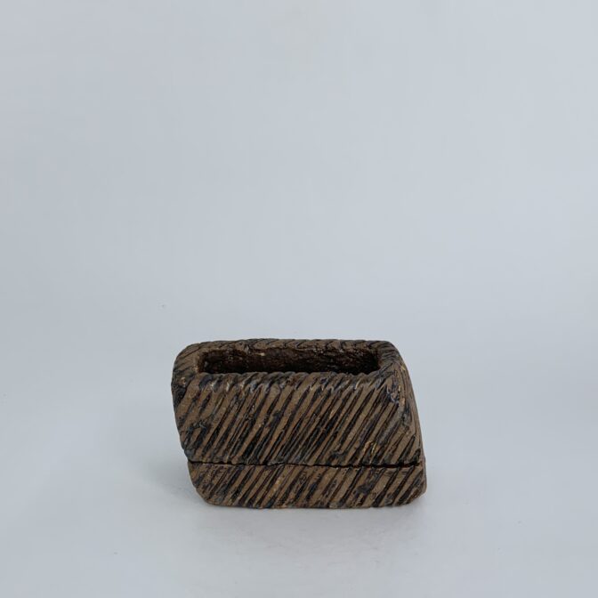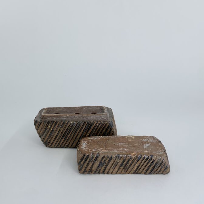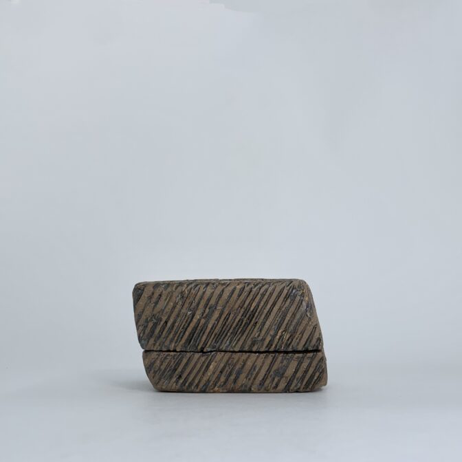 原土を斜めの角柱に成形後、本体と受け皿に分けてそれぞれをくり抜き、上下を合わせてからストライプを彫っています。