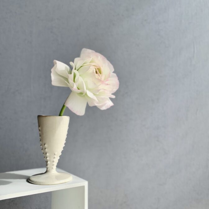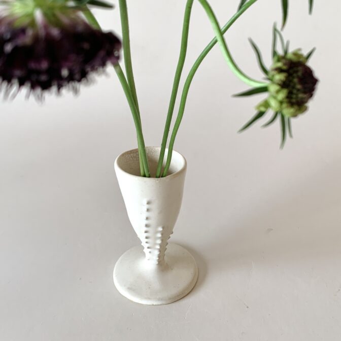 花器 | vase一輪挿し lined seeds vase (off white) 通常価格 3300 円 (税込) 購入はこちら ※商品価格以外に別途送料(1回の注文につき1,000円)がかかります。 説明 size: 約φ4.5㎝ ✕ φ6㎝ (底) ✕ H9㎝ 一列に並んだタネがサイドにくっついた、シンプルなコンポート型の一輪挿しです。 オフホワイトなのでどの色の植物でも相性が良く、底面が広いので安定して使いやすいと思います。 コメントは受け付けていません。