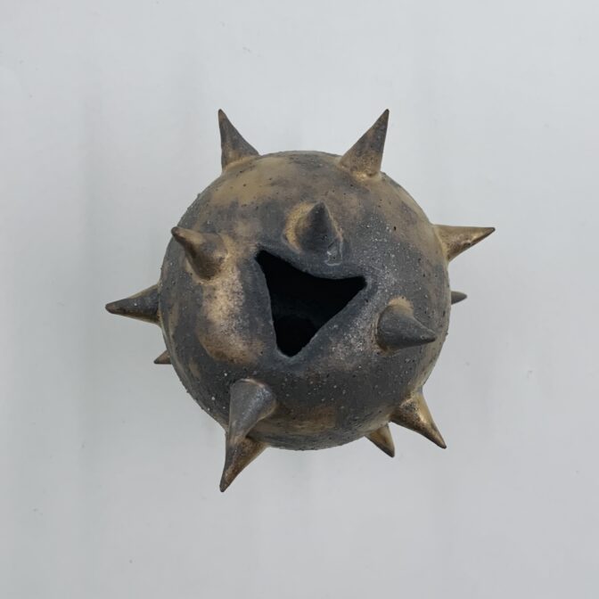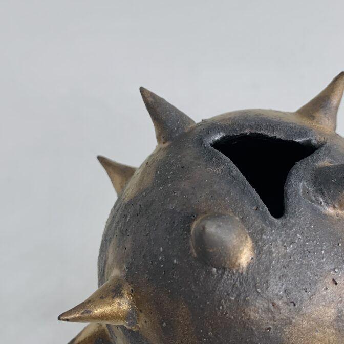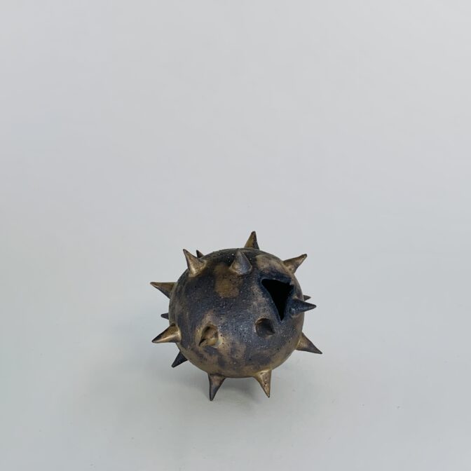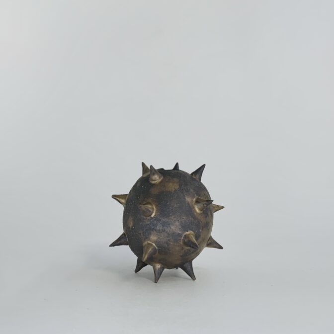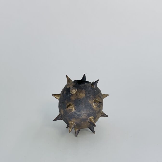 花器 | vase一輪挿し onamomi vase 2 (antique gold) 通常価格 6050 円 (税込) sold out ※商品価格以外に別途送料(1回の注文につき1,000円)がかかります。 説明 size: 約φ10㎝ ✕ H10㎝ 人や動物にくっつく細いトゲの種子(オナモミ)をモチーフにした一輪挿しです。 短めのトゲで上下左右がなく、コロコロ転がしてお好きな角度でお使いいただけます。 花材によって花器口を色々な方向に向けてお楽しみください。 コメントは受け付けていません。