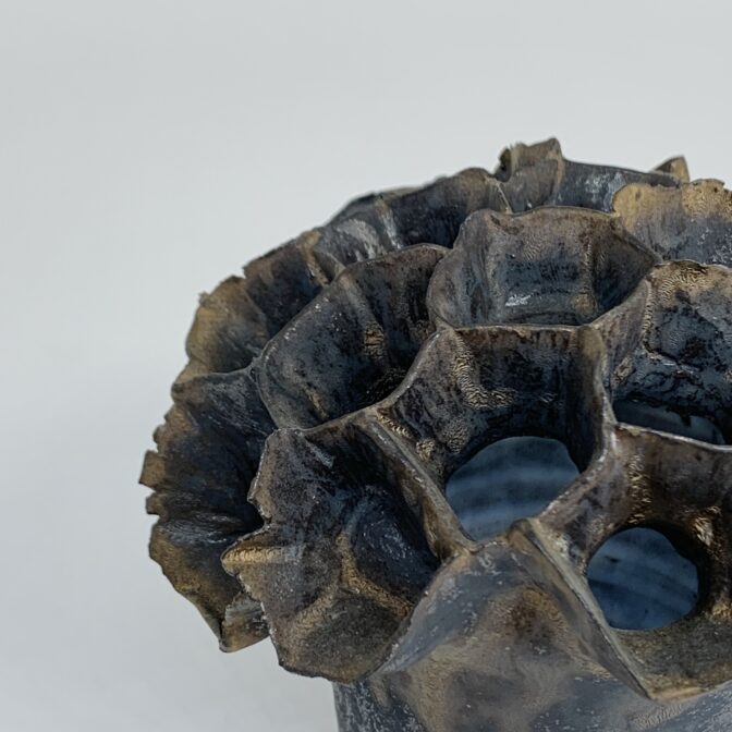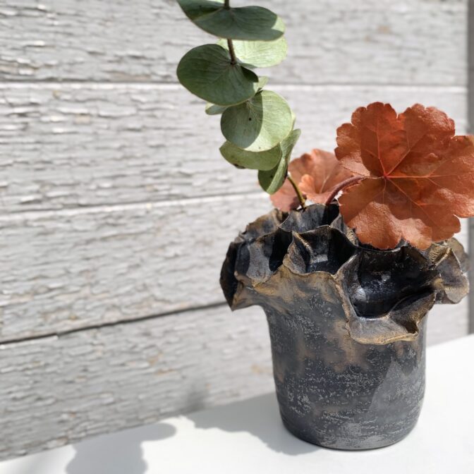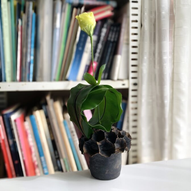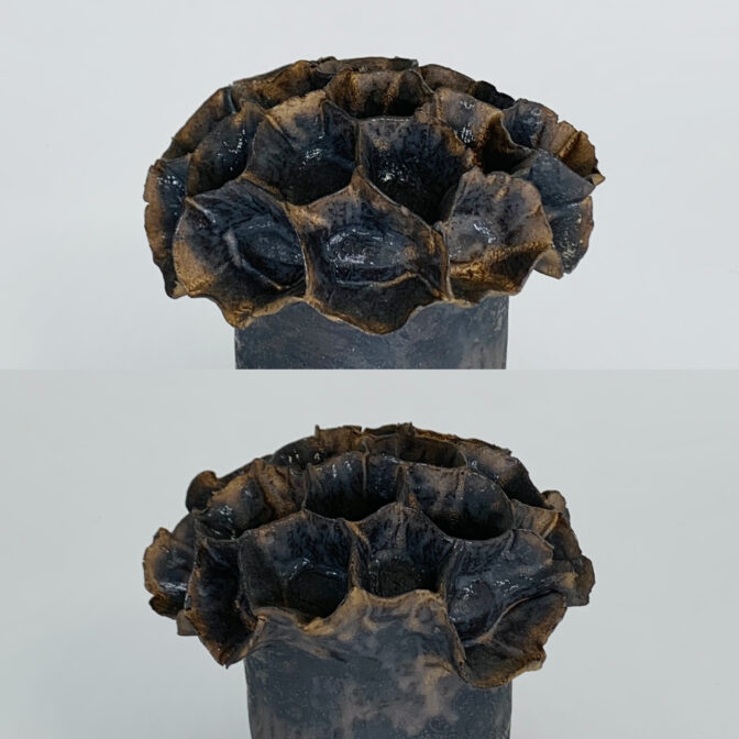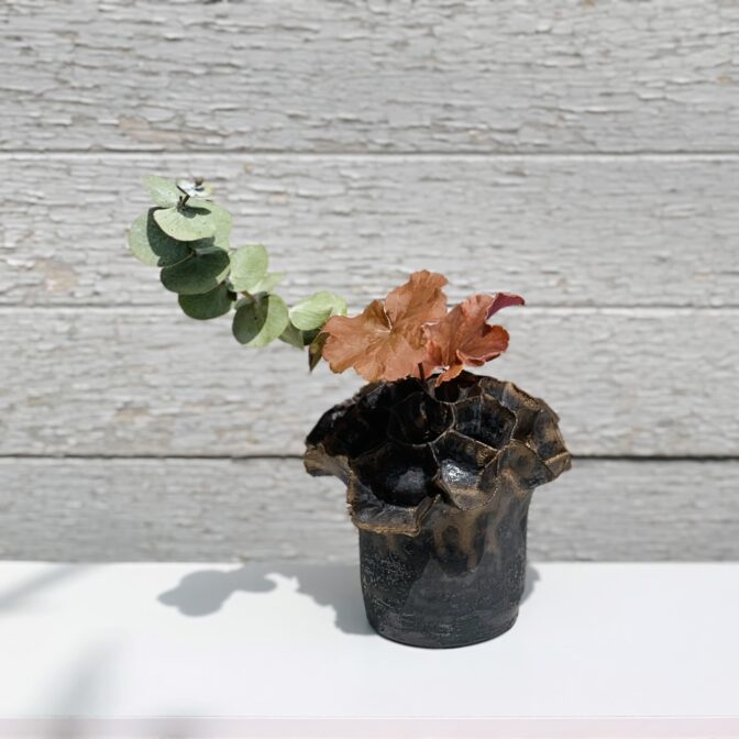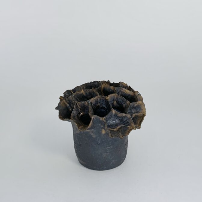花器 | vase花器 scabiosa vase (bronze) 通常価格 19800 円 (税込) 購入はこちら ※商品価格以外に別途送料(1回の注文につき1,000円)がかかります。 説明 size: 約φ12㎝ ✕ H11㎝ スカビオサの実をモチーフにした一輪挿しです。 欠けたようにも見える繊細なヒダ先と、アンティークのような風合いのブロンズ釉が特徴。 ランダムに7つの花器口が開いており、挿す場所によって見え方が変わります。 また一つ一つの花器口が比較的大きいので、ダリア等の太い茎の花も◎ 角度によってイメージが変わるので、色々とお試しください。 コメントは受け付けていません。