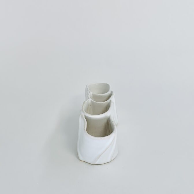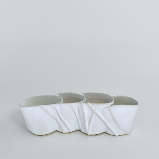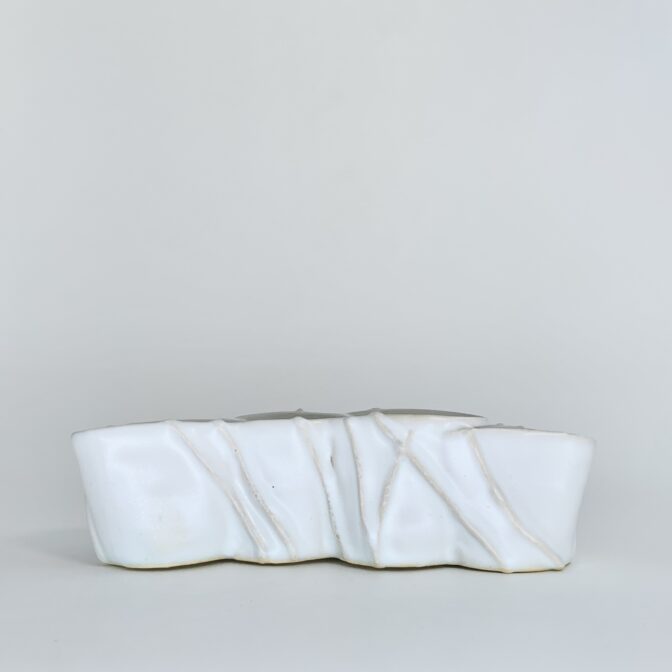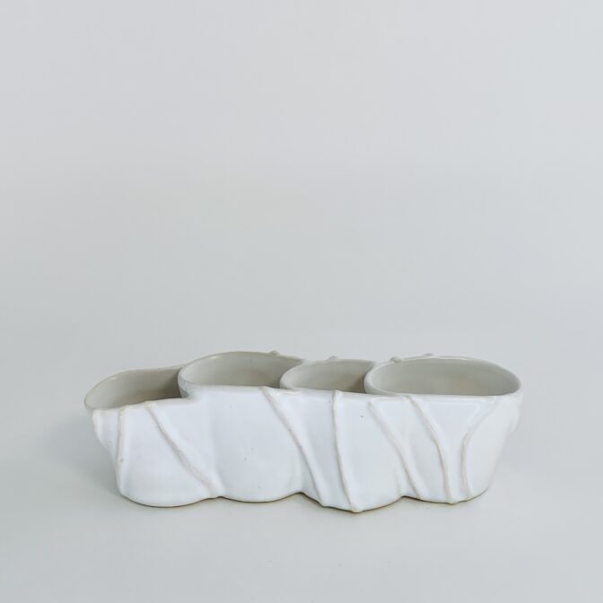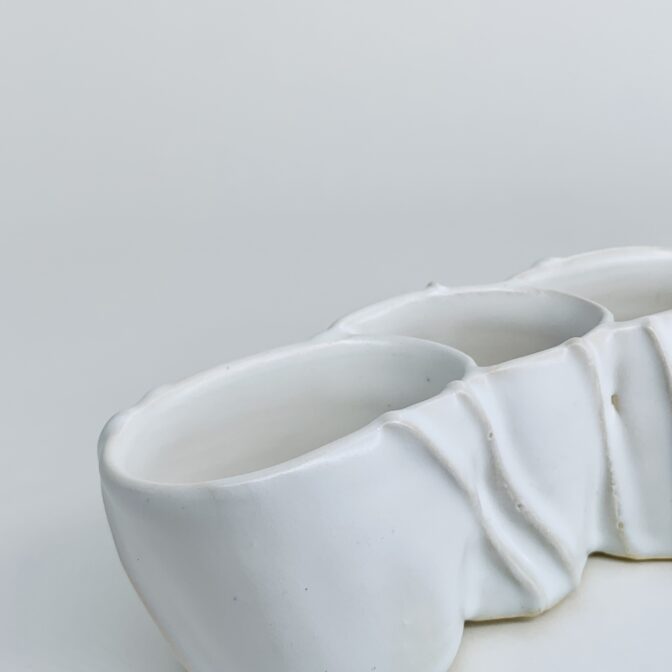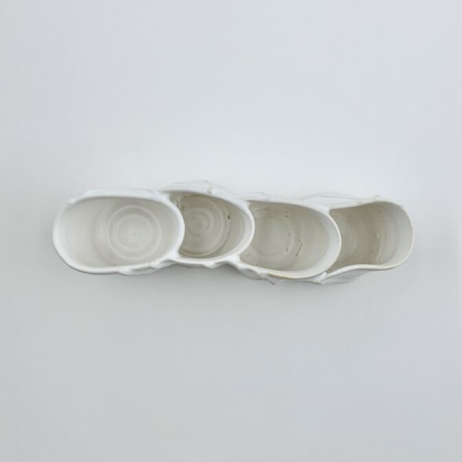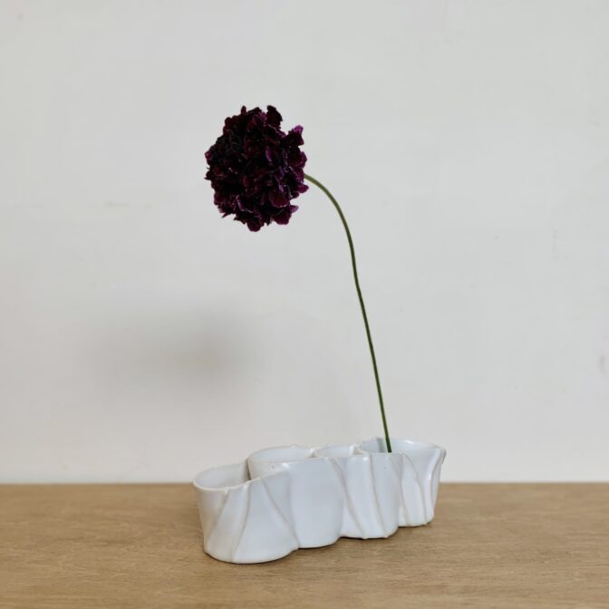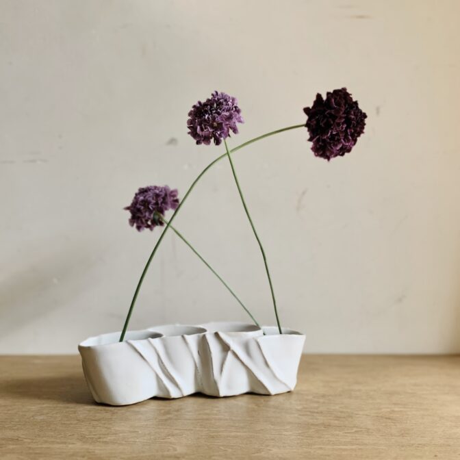 花器 | vase花器 seedpod vase (white) 通常価格 15400 円 (税込) 購入はこちら ※商品価格以外に別途送料(1回の注文につき1,000円)がかかります。 説明 size: 約φ22㎝ ✕ 5.5㎝ ✕ H6㎝ 豆のサヤをモチーフにし、サイドに植物の繊維をデザインした横長の花器になります。 丈の短い花材はそのままでも挿せますが、長いものは花留めがあると安定すると思います。 4個のパーツが並んでいるので、どこに挿すかでイメージが変わります。 試しながらお楽しみください。 * 〈 WHITE 〉シリーズの中では唯一マットな質感です コメントは受け付けていません。