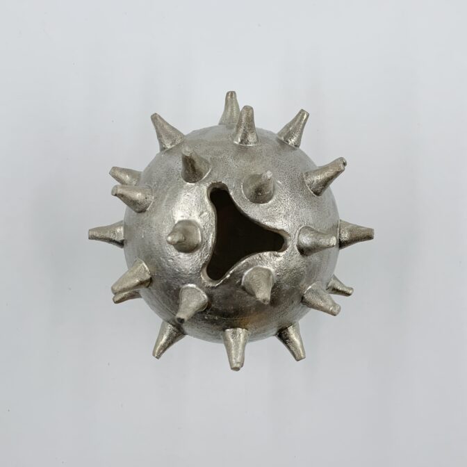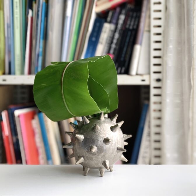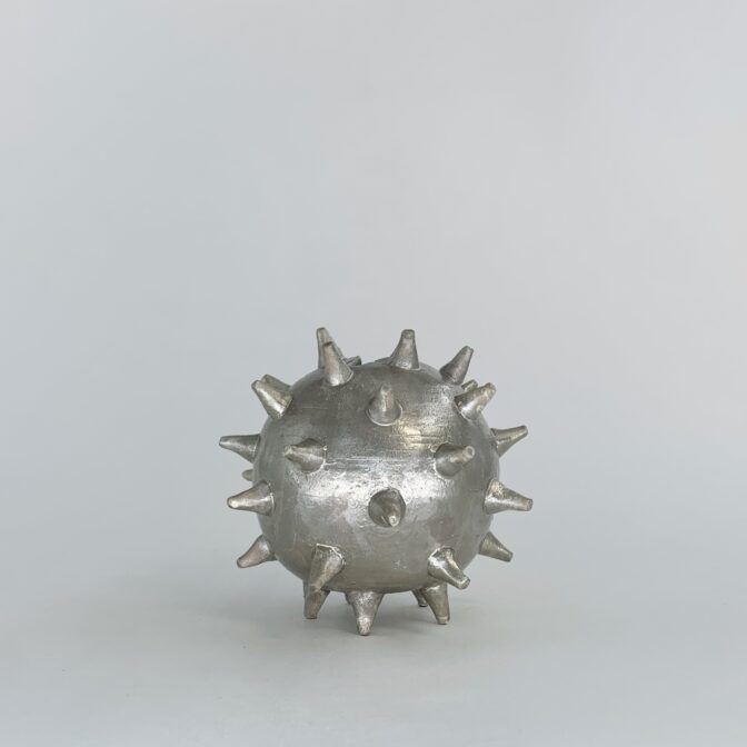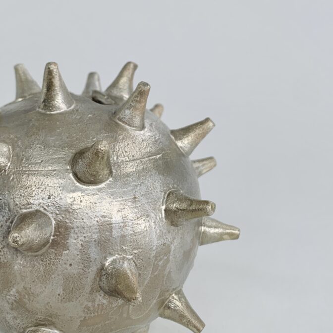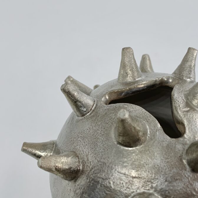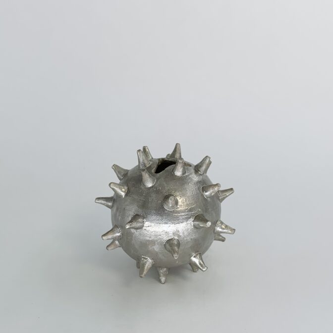 花器 | vase花器 thorn vase 3 (platinum silver) 通常価格 19800 円 (税込) 購入はこちら ※商品価格以外に別途送料(1回の注文につき1,000円)がかかります。 説明 size: 約φ12㎝ ✕ H12㎝ シルバーの光沢とトゲの生えた球体が、一見メカのように見える花器です。 上下左右がないので、コロコロと転がしてお好きな角度でご使用下さい。 トゲトゲの先が欠けたデザインになっており、お取り扱いやすくなっています。 本焼き後に銀彩の上絵付けを施しているので、徐々にアンティークな風合いへと変化する過程も併せてお楽しみください。 コメントは受け付けていません。